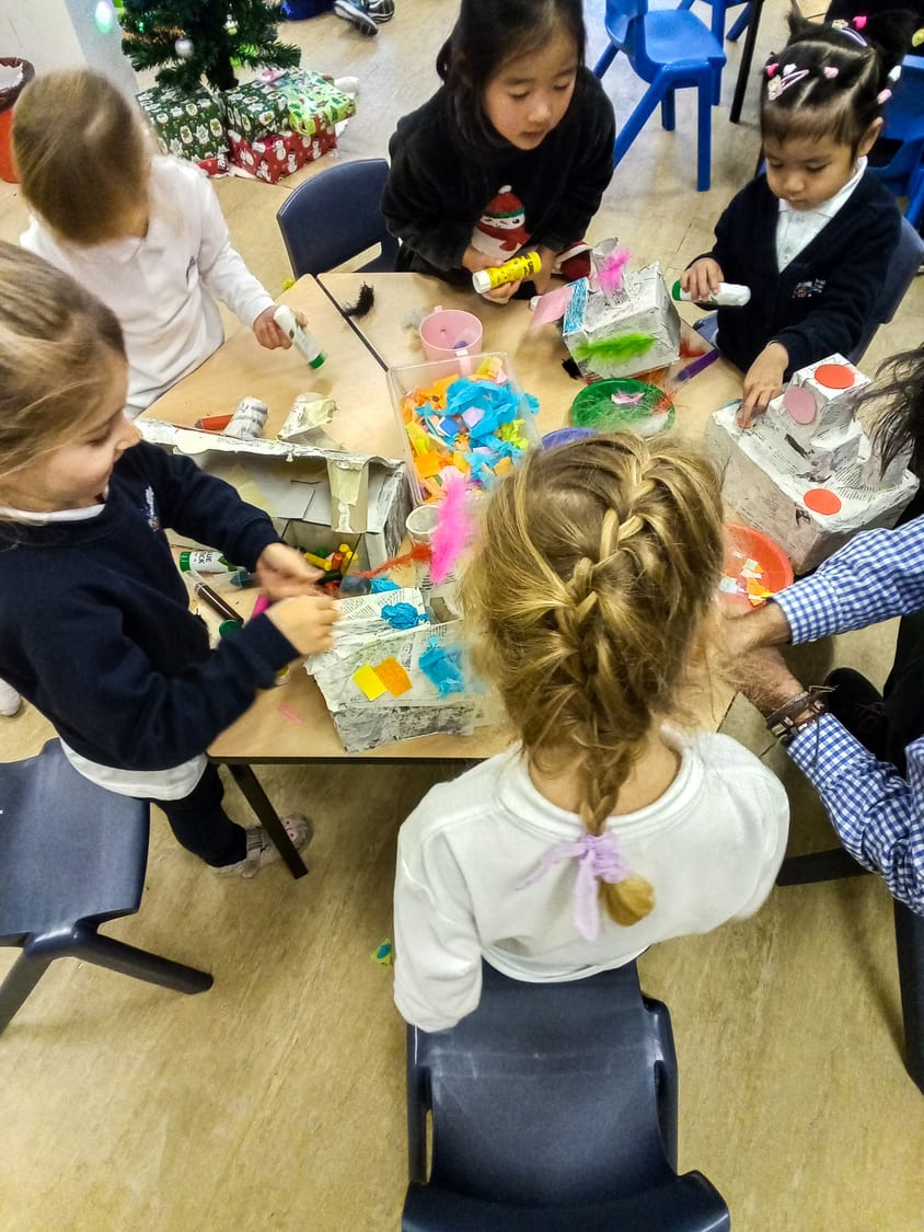 The students finished the whole block project of junk model houses this week in Early Years. The children were consolidating their knowledge about 2D shapes when decorating their homes. They used 2D paper cutouts, bottle caps, feathers, glitters and painted to add features to their houses. Alongside experimenting with shapes, the reception students have continued to practise letter formation and written labels of house features.