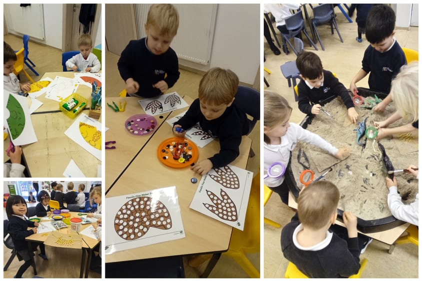Our students become palaeontologists for a week uncovering and studying fossils covered in the sand. They had fun discovering and exploring the fossils with a magnifying glass and practising new dinosaur[1]related vocabulary while discussing their findings. To better understand how the fossils are made, the students have been creating pasta dinosaur skeletons and placing buttons on paper shells and footprint fossils with tweezers.